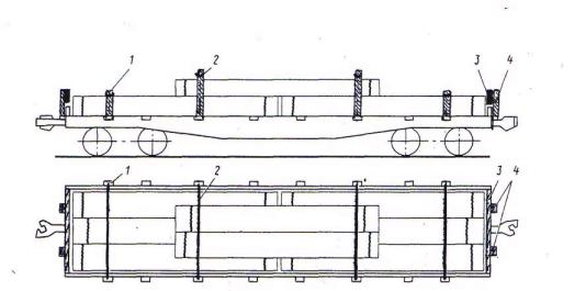 Рис. 10.22 Загальний вигляд платформи, завантаженої сортовим металом у два яруси (два нижніх і один верхній штабелі): 1 – бокові короткі стояки; 2 –