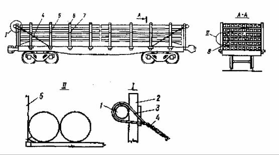 При навантаженні такого ж сортового металу на платформу, борти яких мають вертикальні гофри і закидки, кріплення виконується шляхом установлення з кожного боку двох стояків, які попарно ув’язуються трьома нитками дроту діаметром 6мм.