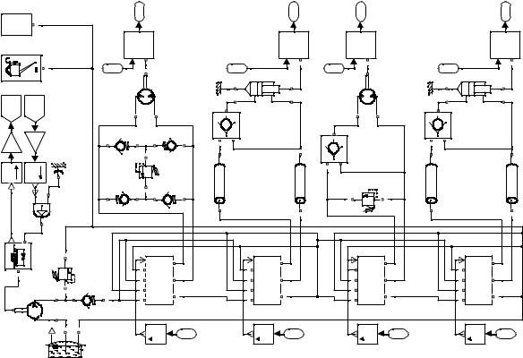 Гидропривод является важной подсистемой сложной динамической системы СГК. Подсистема гидропривод рассматривается как совокупность соединенных между собой элементов: трубопровод; гидравлический мотор; гидравлический насос; местное сопротивление (дроссель); гидроцилиндр; клапаны (предохранительный, обратный). Для каждого из элементов, входящих в гидропривод, составлена своя математическая модель, представляющая собой дифференциальные уравнения. Уравнения, описывающие гидравлические элементы, реализуются в среде Simulink при помощи блоков из библиотек SimHydraulics, Simscape. Структурная схема подсистемы гидропривод СГК, включающая в себя модели гидроэлементов, представлена на рисунке 4.