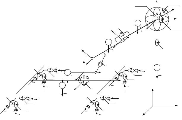 Математическое описание механической подсистемы СГК основывалось на следующих допущениях: СГК представляет собой шарнирно-сочлененный пространственный многозвенник, с наложенными на него упруго-вязкими связями; элементы металлоконструкций представляются абсолютно жесткими; инерционные свойства элементов металлоконструкций характеризуются массами, координатами центров масс, осевыми моментами инерции, центробежными моментами инерции; люфты в шарнирах отсутствуют; связи, наложенные на динамическую систему СГК, являются голономными и стационарными; внешние силы, действующие на звенья механической подсистемы СГК, являются сосредоточенными.