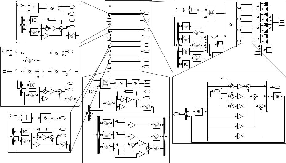 Рисунок 3 – Структурная схема механической подсистемы стрелового грузоподъемного крана в Simulink (пунктирными линиями обозначены блоки звеньев)