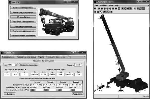 Рисунок 14 – Графический интерфейс системы автоматизации моделирования СГК: a) вид окна главного меню; б) вид окна ввода параметров базового шасси СГК; в) вид окна трехмерной анимации механической подсистемы СГК в процессе моделирования (пример)