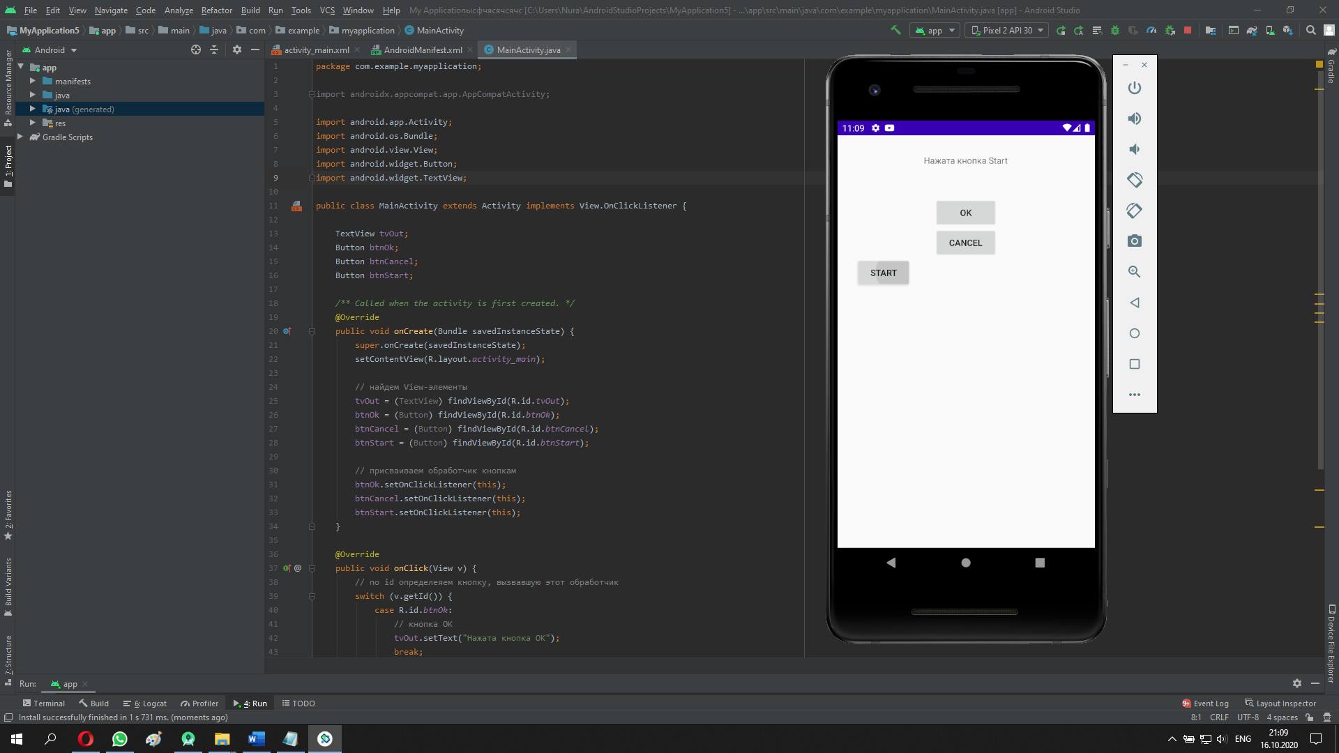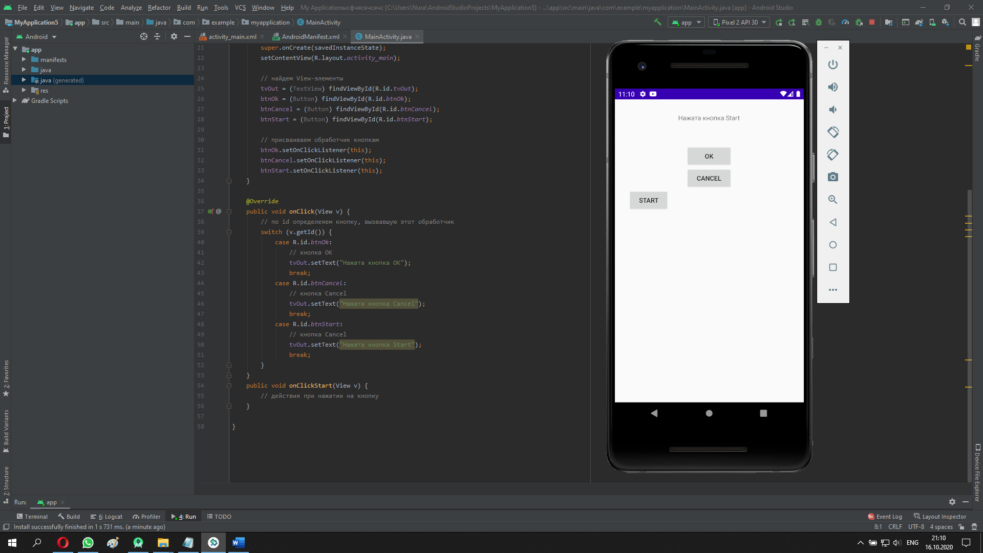 package com.example.myapplication; import androidx.appcompat.app.AppCompatActivity; import android.app.Activity; import android.os.Bundle; import android.view.View; import android.widget.Button; import android.widget.TextView; public class MainActivity extends Activity implements View.OnClickListener { TextView tvOut; Button btnOk; Button btnCancel; Button btnStart; /** Called when the activity is first created. */ @Override public void onCreate(Bundle savedInstanceState) { super.onCreate(savedInstanceState); setContentView(R.layout.activity_main); // найдем View-элементы tvOut = (TextView) findViewById(R.id.tvOut); btnOk = (Button) findViewById(R.id.btnOk); btnCancel = (Button) findViewById(R.id.btnCancel); btnStart = (Button) findViewById(R.id.btnStart); // присваиваем обработчик кнопкам btnOk.setOnClickListener(this); btnCancel.setOnClickListener(this); btnStart.setOnClickListener(this); } @Override public void onClick(View v) { // по id определеяем кнопку, вызвавшую этот обработчик switch (v.getId()) { case R.id.btnOk: // кнопка ОК tvOut.setText("Нажата кнопка ОК"); break; case R.id.btnCancel: // кнопка Cancel tvOut.setText("Нажата кнопка Cancel"); break; case R.id.btnStart: // кнопка Cancel tvOut.setText("Нажата кнопка Start"); break; } } public void onClickStart(View v) { // действия при нажатии на кнопку } }
