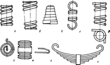 Разнообразие видов пружин, применяемых в технике очень велико. По характеру работы пружины делят на работающие при сжатии, растяжении, кручении, изгибе.По форме пружины подразделяются на винтовые, спиральные, тарельчатые, плоские (рис. 34). Пружины при работе могут испытывать следующие виды нагрузок: статические, динамические, циклически изменяющиеся.