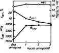 Рис. 43. Влияние числа отпусков при 560°С, 1 ч на твердость, количество остаточного аустенита и прочность стали Р18