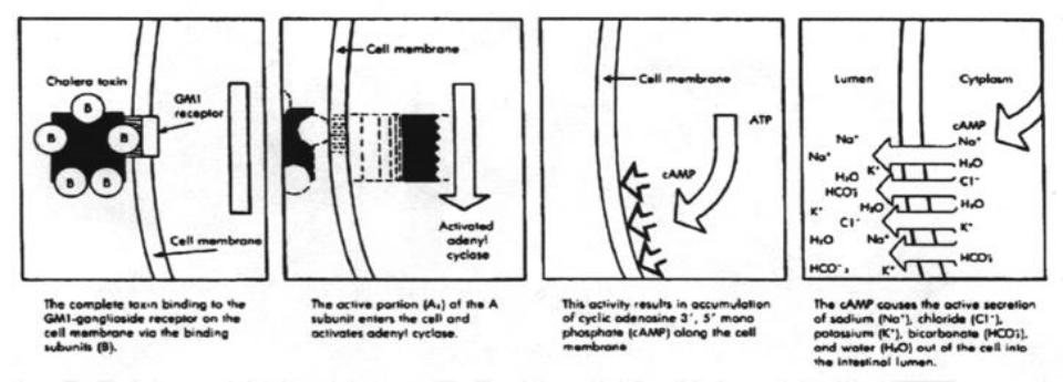 стимулируют гиперсекрецию клетками кишечника жидкости, содержащей ионы Na+, К+, Сl-, бикарбонаты. Это приводит к нарушению водно-солевого обмена и развитию диареи. Обнаружены два варианта энтеротоксинов: термолабильные энтеротоксины (LT - от англ. labile toxin - лабильный токсин)
