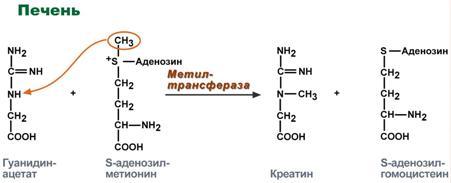 реакциях. По окончании синтеза креатин с током крови доставляется в мышцы или мозг.