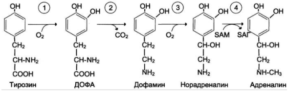 дофамина, который при участии дофамингидроксилазы (3) (монооксигеназы) превращается в норадреналин. Для функционирования фермента необходимы ионы Сu+, витамин С и тетрагидробиоптерин.