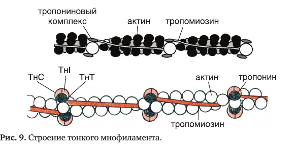 тропонин Т, тропонин С и тропонин I. Он нековалентно связан с тропомиозином и с актином; на каждую молекулу тропомиозина приходится одна молекула тропонина.
