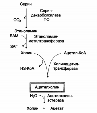 основной нейромедиатор в парасимпатической нервной системе. Четвертичное аммониевое основание. В организме очень быстро разрушается специализированным ферментом – ацетилхолинэстеразой. Синтезируется в нервной ткани