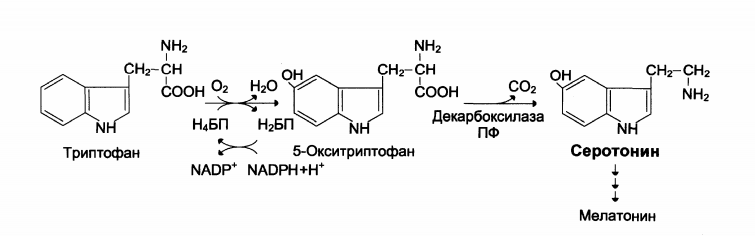 Образуется в надпочечниках и ЦНС из аминокислоты 5-гидрокситриптофана под