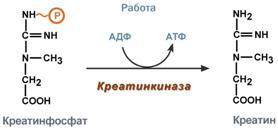 почках и печени, при наличии энергии АТФ (во время покоя или отдыха) он фосфорилируется с образованием креатинфосфата.