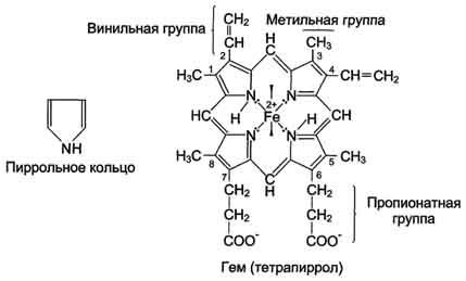 кольца соединены метиленовыми мостиками – содержит 4 метильные, 2 винильные и 2 пропионатные боковые цепи (в целом – протопорфирин).