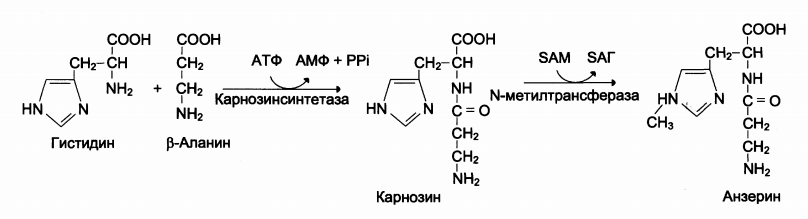 Карнозин и анзерин – гистидиновые дипептиды, синтезирующиеся в мышцах и ГМ.
