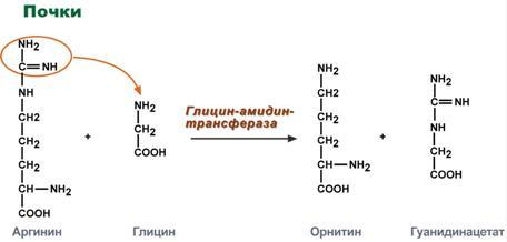 Синтез креатина идет последовательно в почках и печени в 2х трансферазных