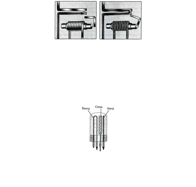 микачі (реле), які використовувалися тоді в телефонному зв'язку. Принцип роботи реле показано на рисунку 1.10.1: коли перемикач відкритий (рис. 1.10.1, а), струму в електричному колі немає. Але, якщо на обмотку залізного осердя (рис. 1.10.1, б) подається струм низької напруги, то в осерді створюється магнітне поле, яке притягує один кінець важеля, інший його кінець у цей момент стискує контакти: коло замикається і по ньому починає проходити електричний струм.