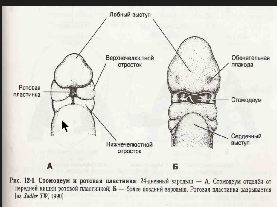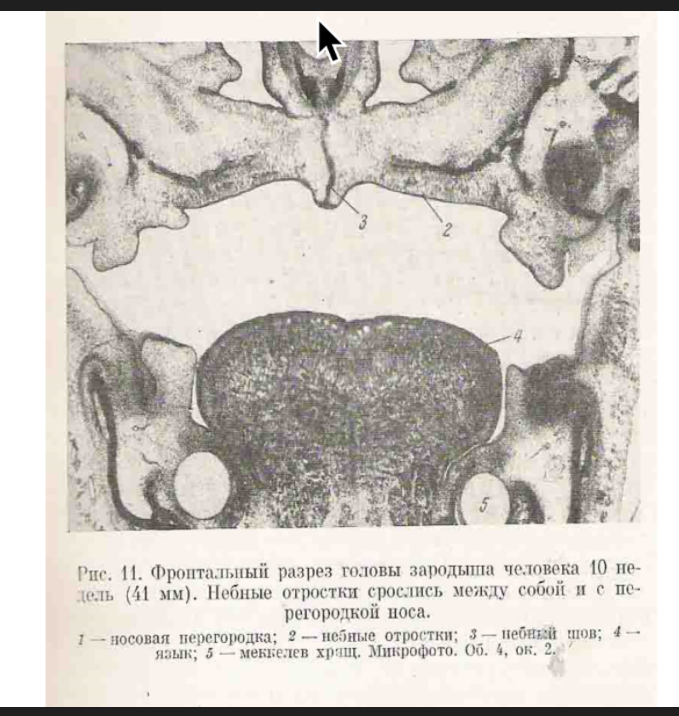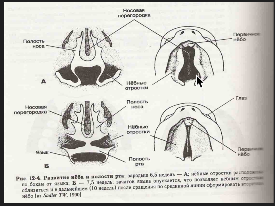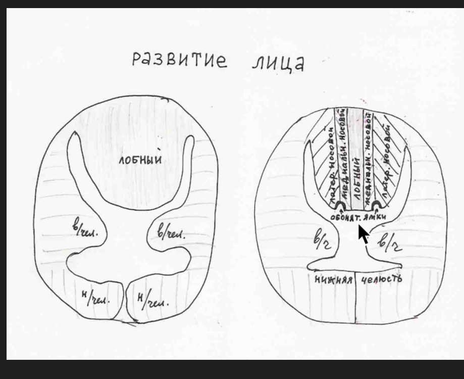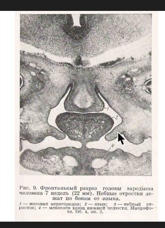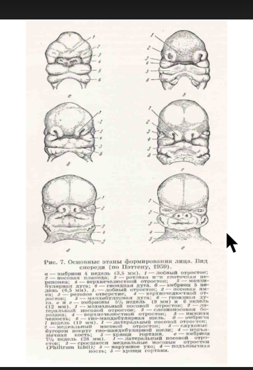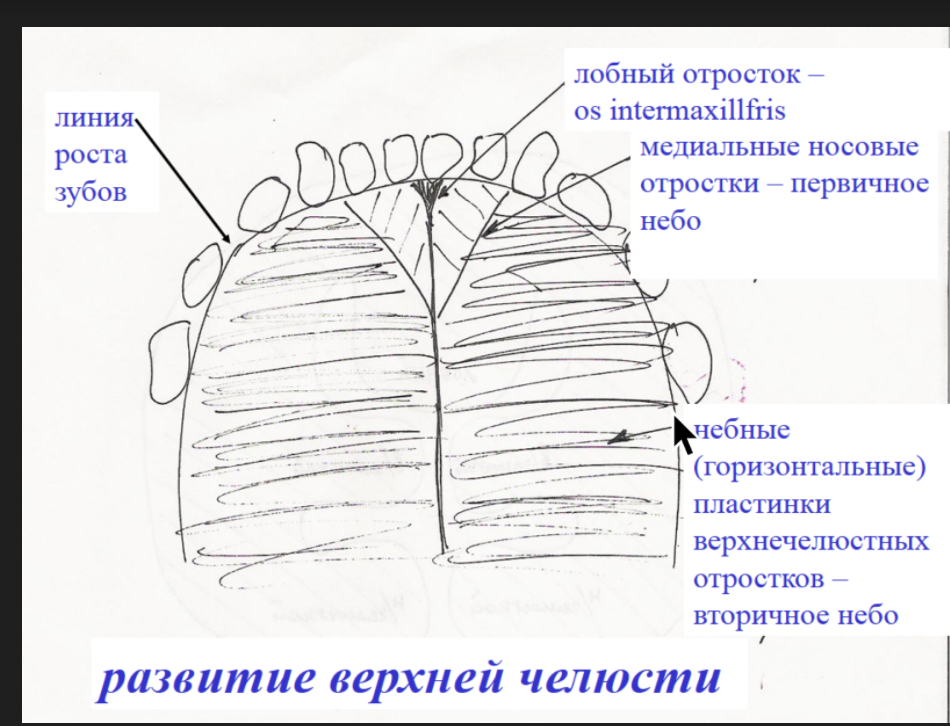 Верхнечелюстной отросток – срастается с латеральным носовым и формирует носо-слёзный канал, формирует большую латеральную часть верхнеё губы и челюсти – срастаясь с медиальным – носовым отростком; от него растут нёбные пластинки(горизонтальные пластинки), дающие вторичное нёбо(большую часть нёба)
