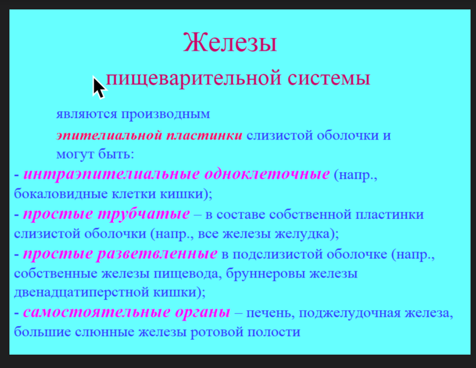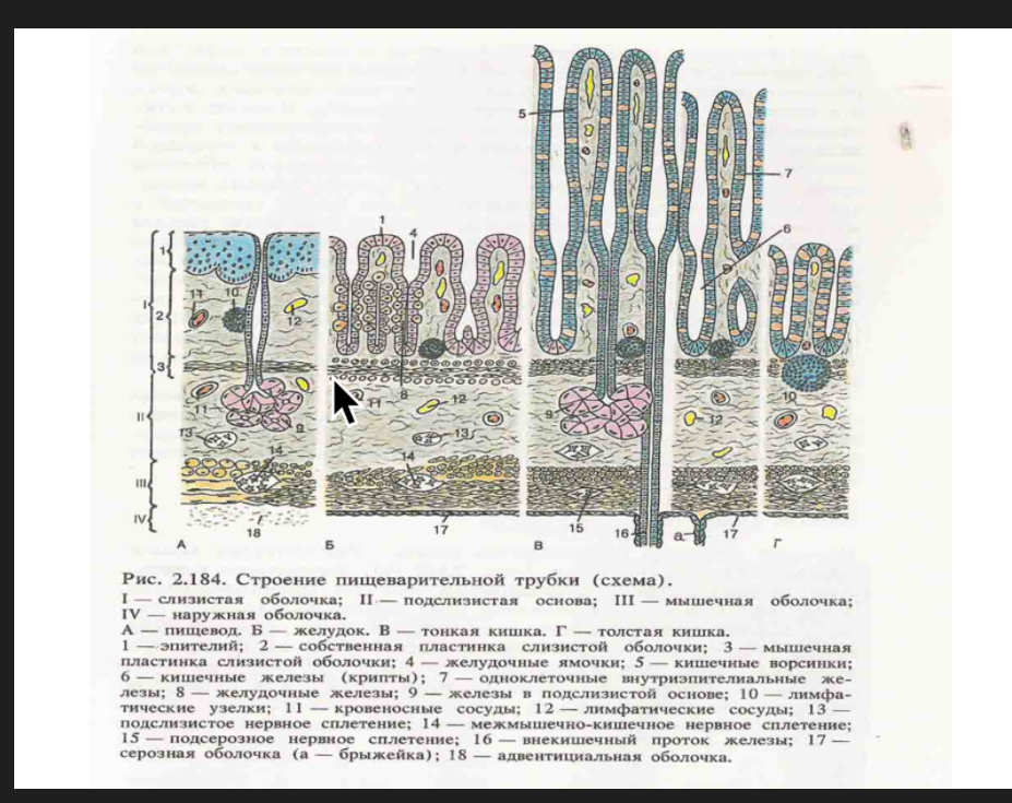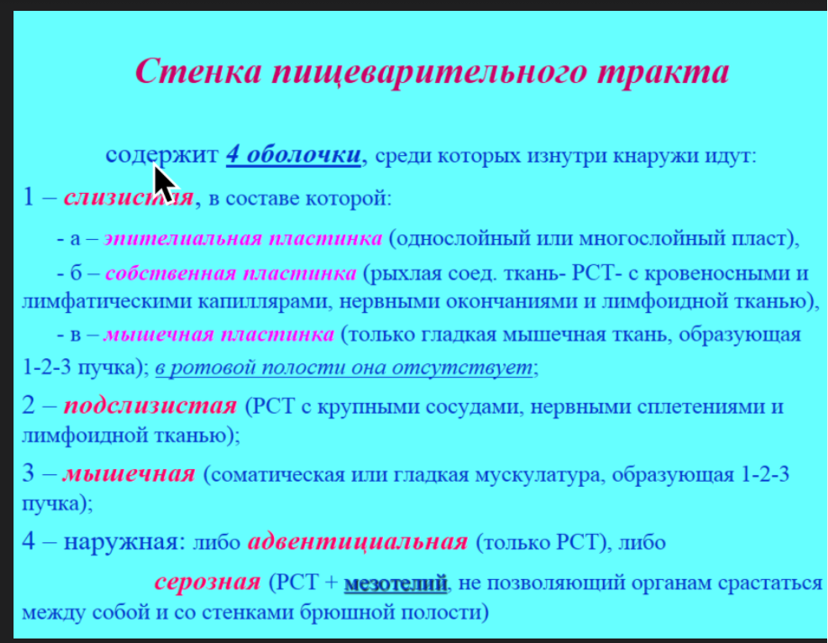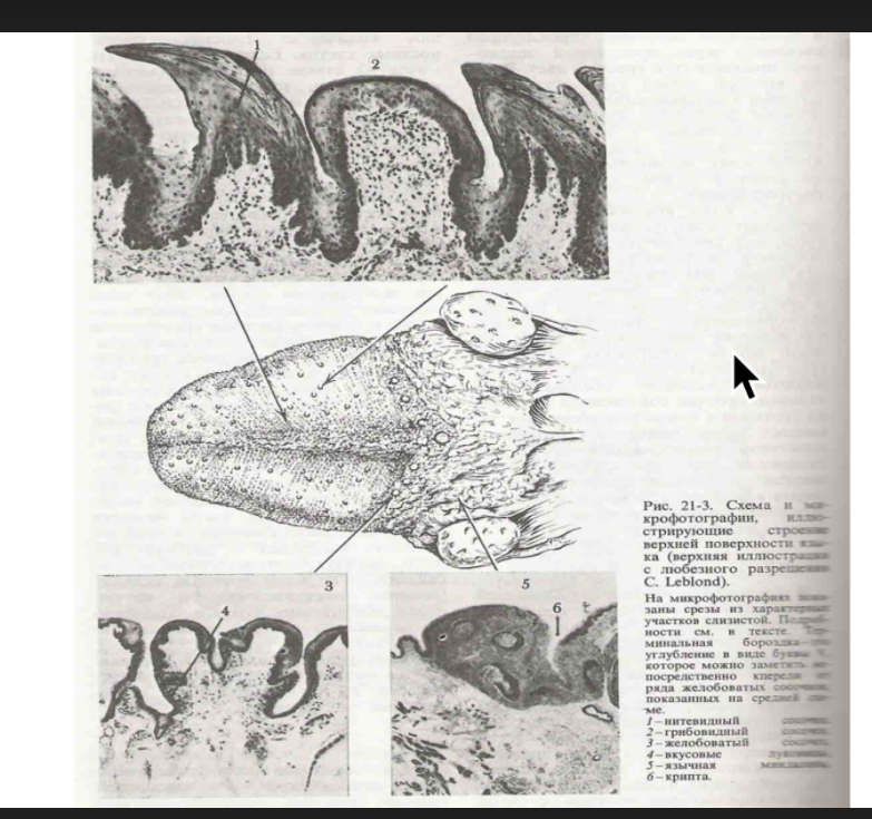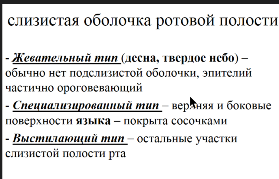 Слизистый тип – подслизистой нет, слизистая образует выроста(сосочки) 4х типов и плотно сращена с подлежащей соматической мышцей языка