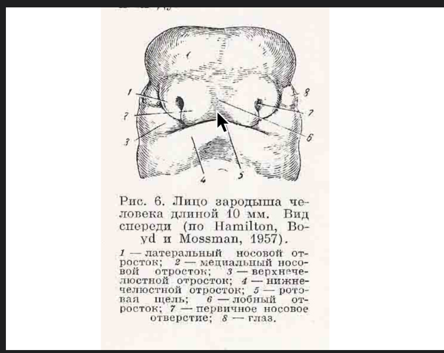 Медиальный носовой отросток – медиальную часть крыла носа, переднюю резцовую часть верхней челюсти и центральную часть верхней губы, первичное нёбо за резцами