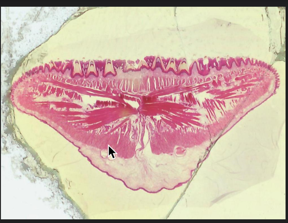 - желобоватые – их от 6 до 12 штук, самые крупные, но спрятаны в толщу органа, диаметр до 3 мм, выстоа до 1 мм, лежит на дне жолоба, окружён валом. На них больше половины всех вкусовых рецепторов находящ во рту.и И в самом сосочке и в окруж вале есть мелкие пучки гладк мышцы, которые рефлекторно сокращаются при попадании на них пищи – способствуют выработке хим вещ-в