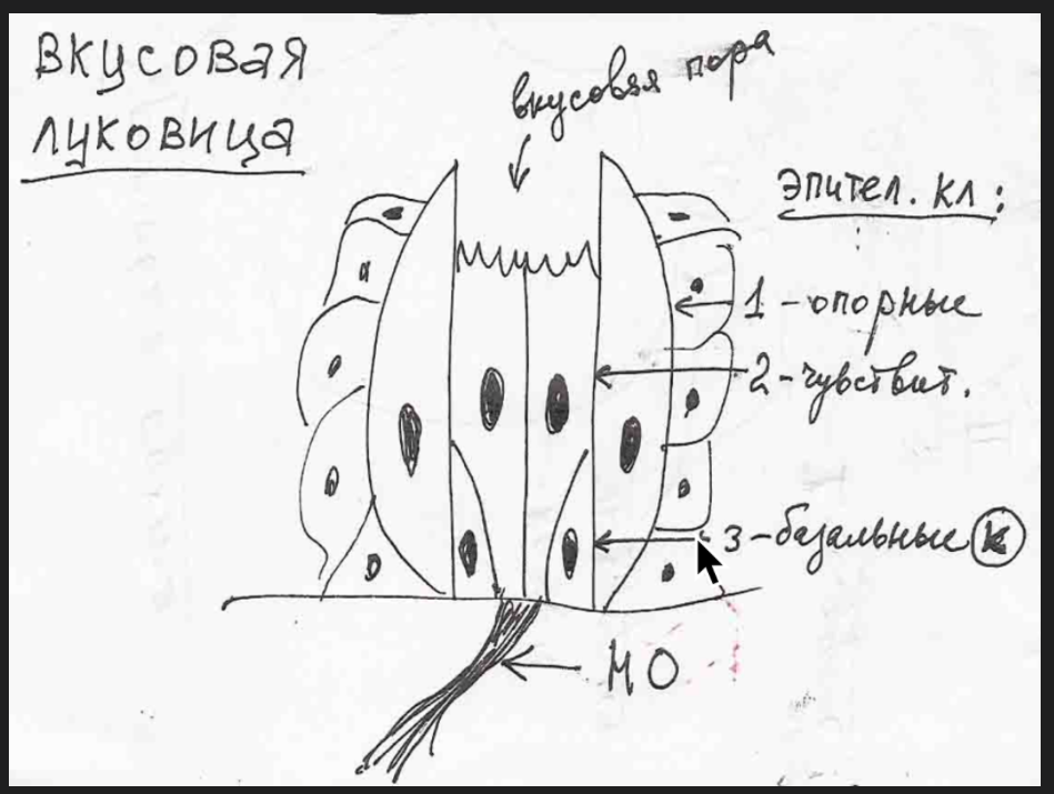 - грибовидный сосочек – единичные вкусовые луковицы(если есть) лежат на верхушечной поверхности, от тела к кончику языка их становится меньше, но они крупные