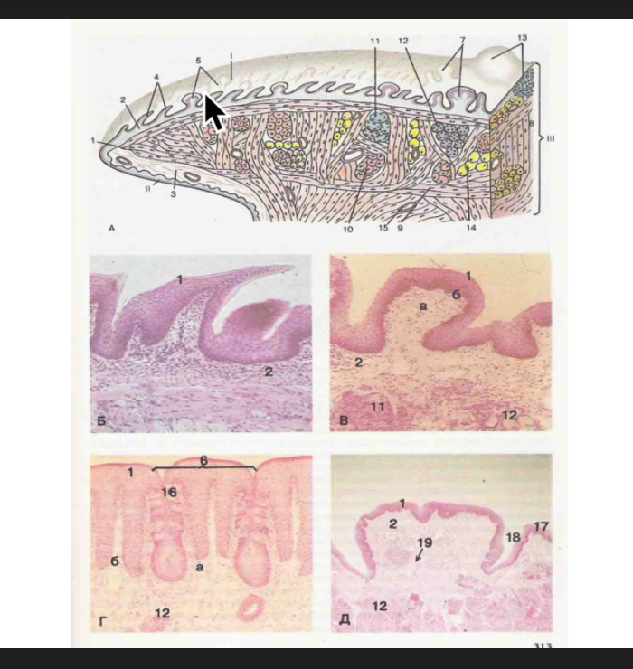 - листовидный сосочек – как складки (10 или больше) на боковой поверхности языка в возрасте 10-12 лет редуцируются и замещаются жировой тканью, эпителий глубоко, много луковиц вкусовых рецепторов на боковой поверхности( считается – более чуссвит к сахару)