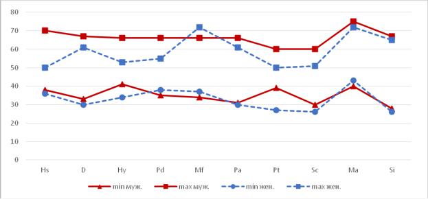 Рисунок - 1 Минимальные и максимальные показатели по шкалам методики MMPI (в модификации Ф. Б. Березина) следователей-мужчин и следователей-женщин УВД по ЦАО ГУ МВД по г. Москва