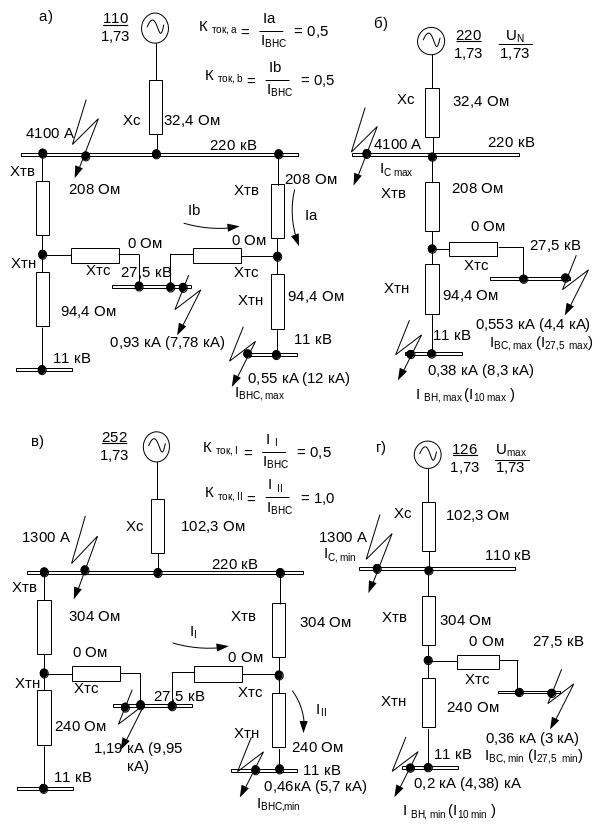 а, в, - при параллельной работе; б, г, - при одиночной работе трансформаторов
