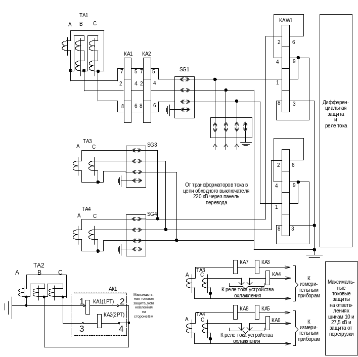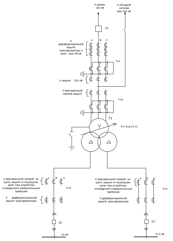 Схема дана для трёхобмоточного трансформатора 220/27,5/10,5 кВ мощностью 40 МВA при наличии на сторонах 220, 27,5 , 10,5 кВ сборных шин. На стороне 220 кВ установлен выключатель и выносные трансформаторы тока, а на сторонах 27,5 и 10,5 кВ - выключатели со встроенными во втулки его трансформаторами тока.