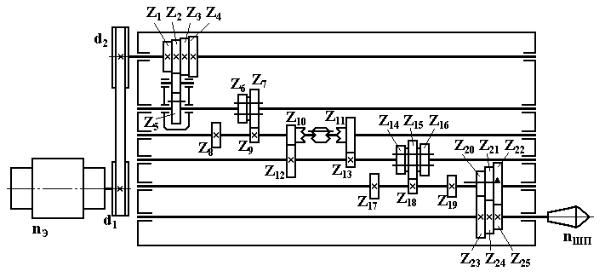 3. Провести анализ кинематической цепиИглавного движения условного станка, приведенной на рис. 50, включающий написание уравнений кинематического баланса в общем и развернутом видах. Определить количество скоростей вращения шпинделя, максимальные и минимальные значения оборотов шпинделя.