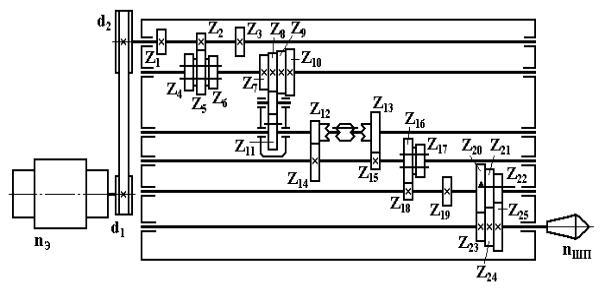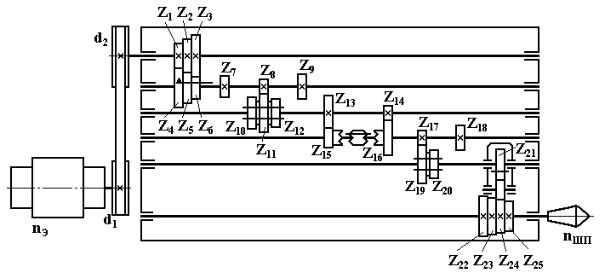 уравнений кинематического баланса в общем и развернутом видах. Определить количество скоростей вращения шпинделя, максимальные и минимальные значения оборотов шпинделя.