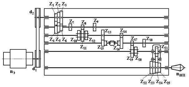 ловного станка, приведенной на рис. 11, Ивключающий написание уравнений кинематического баланса в общем и развернутом видах. Определить количество скоростей вращения шпинделя, максимальные и минимальные значения оборотов шпинделя.
