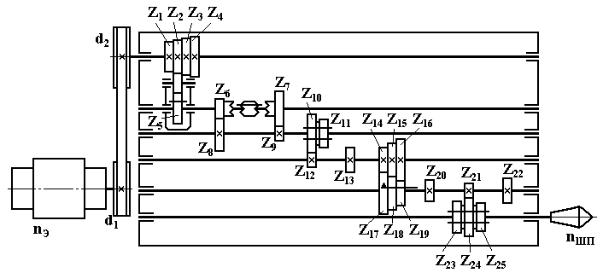 3. Провести анализ кинематической цепи главного движения условного станка, приведенной на рис. 23, включающий написание уравнений кинематического баланса в общем и развернутом видах. Определить количество скоростей вращения шпинделя, максимальные и минимальные значения оборотов шпинделя.