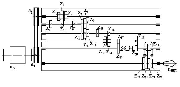3. Провести анализ кинематической цепи главного движения условного станка, приведенной на рис. 27, включающий написание уравнений кинематического баланса в общем и развернутом видах. Определить количество скоростей вращения шпинделя, максимальные и минимальные значения оборотов шпинделя.