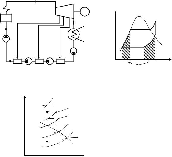 стью. Другой путь – приближение его конфигурации к конфигурации цикла Карно за счет регенерации теплоты, промежуточного перегрева пара между ступенями турбины, применение бинарных циклов. Третий путь – комбинированная выработка механической энергии (преобразующейся на электростанциях в электричество) и теплоты для технологических нужд промышленности и отопления, осуществляемая на теплоэлектростанциях (ТЭЦ). В теплофикационных турбоустановках конденсатор исключается вообще или же давление в нем повышается до 30-60 МПа.