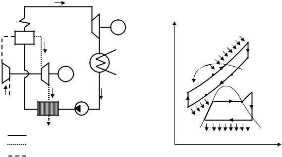 на частичное расширение в газовую турбину ГТ (процесс 5-6), мощность которой используется для привода компрессора, и затем в экономайзер Э, где благодаря теплообмену с питательной водой (процесс 6-7) вырабатывается пар или горячая вода. Далее газовый поток, пройдя влагоотделитель ВО, направляется в холодильную часть, где охлаждается (процесс 7-8) обратным потоком в регенераторе Р.