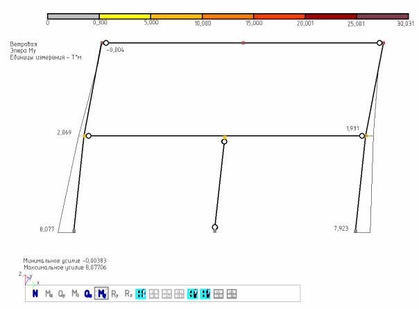 В результате на расчетной схеме показаны эпюры изгибающих моментов MY со значениями в характерных точках (рис. 5.3).