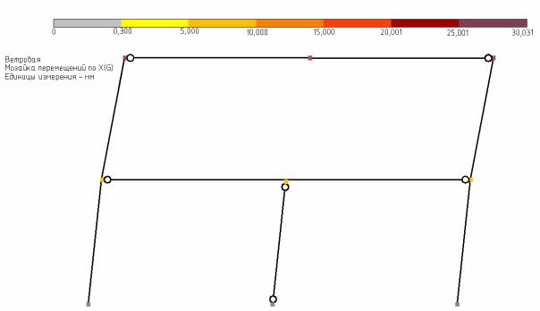 меню «Мозаика перемещений» (Деформации / В глобальной системе / Узловые перемещения / Мозаика перемещений по Х). В левом верхнем углу рабочей области показаны наименование мозаики и единицы измерения, а в верхней части – цветовая шкала перемещений. В результате на расчетной схеме узлы окрасились в цвета в соответствии с перемещениями по цветовой шкале (рис. 5.4).