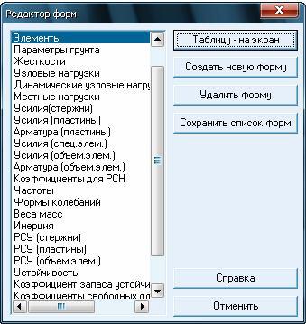 В диалоговом окне «Редактор форм» производится выбор нужной таблицы из списка. В данном примере интерес представляют следующие пункты: