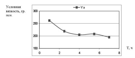 Зависимость вязкости нефтяного гудрона от времени термостатирования имеет обратный экспоненциальный характер. Наибольшая вязкость приходится на 4 часа термостатирования. Уменьшение или увеличение этого времени снижает условную вязкость получаемого вяжущего. Физическая сущ-