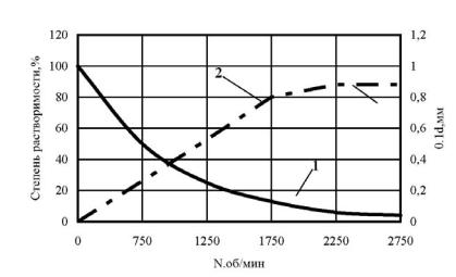 Рис. 2.12. Влияние средней скорости вращения роторов на тонкость помола (1) и степень растворения резиновой крошки (2).