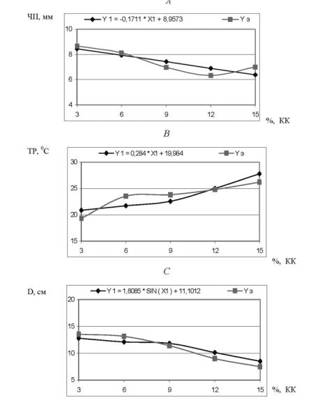 Рис. 2.3. Влияние содержания каучуковой крошки (X1) на условную вязкость (А), температуру размягчения (B) и растяжимость (С) нефтяного гудрона