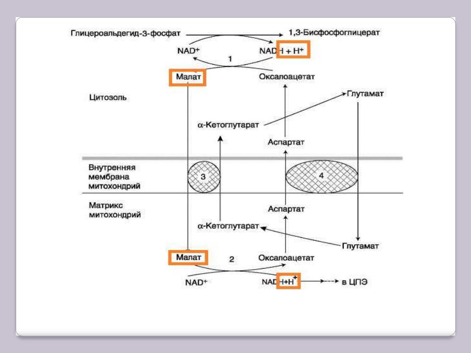 1, 2 – окислительно-восстановительны реакции, обеспечивающие транспорт водорода из цитозоля в митохондрии на ЦПЭ; 3, 4 – транслоказы, обеспечивающие транспорт α-кето-глутарата, аспартата и глутамата через мембрану митохондрий.