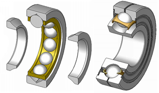 Подшипники с разъемными кольцами для восприятия повышенных осевых и радиально-осевых сил. Разъем позволяет увеличить число шариков и углубить беговые дорожки. Применяются только при наличии осевых сил, иначе будет контакт в трех точках, что приведёт к повышенному скольжению. Угол α=20 о...30 о.