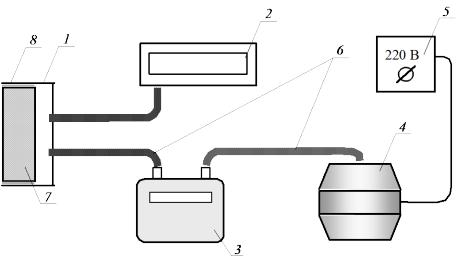 1 – обойма; 2 – напорометр; 3 – газовый счетчик; 4 – пылесос; 5 – лабораторный автотрансформатор; 6 – соединительные трубки; 7 – исследуемый образец; 8 – герметик