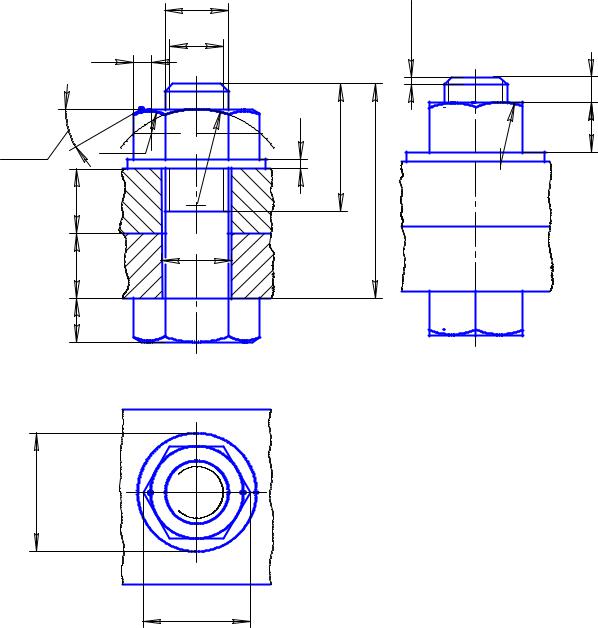 Радиус скругления гайки и головки болта на виде слева R1 = d. Болт, гайку и шайбу, попадающих в продольный разрез плоскостью,