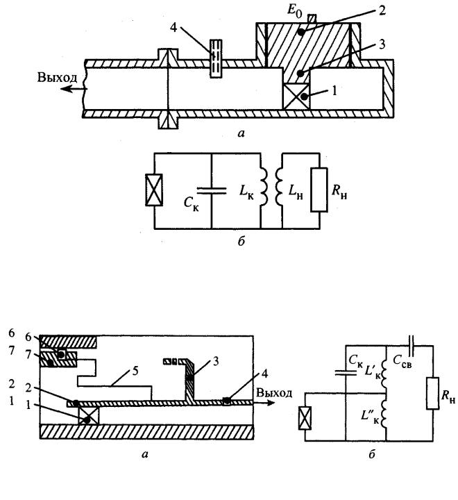 зонатора с диодом. Для регулировки связи с нагрузкой служит винт 4, настройка резонатора на требуемую частоту осуществляется изменением длины короткозамкнутого участка волновода. Такая конструкция соответствует параллельному колебательному контуру, ее эквивалентная схема показана на рис. 1.34, б.