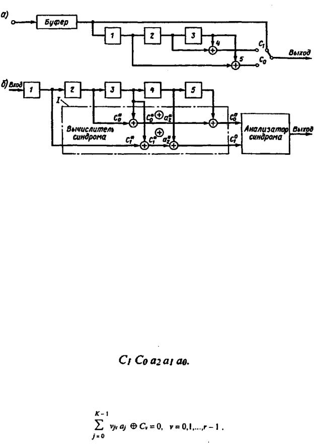 ячейку 1, а содержимое ячейки 1 переписывается в ячейку 2. В момент времени t3 (через t после t2) на выход кодера проходит символ a2 и записывается в ячейку 1, содержимое ячейки 1 записывается в ячейку 2, а содержимое ячейки 2 записывается в ячейку 3. Таким образом в момент времени t3 на выходе кодера имеются информационные символы а2, а1, а0 и в ячейках регистра сдвига соответственно записаны символы: ячейка 1 — а2, ячейка 2 — а1 и ячейка 3 — а0 . В момент времени t4 (через t после t3) сумматор 5 по модулю 2 образует проверочный символ c0, взяв содержимое ячеек 1 и 5 регистра сдвига, т.е. суммирует информационные символы a0 и a2. Результат суммирования подается на выход кодера. В момент времени t5 (через t после t4 ) аналогичную операцию выполняет сумматор 4 и на выход кодера проходит проверочный символ С1.