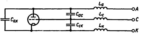 Основной особенностью двухконтурных автогенераторов СВЧ является то, что под влиянием паразитных реактивных элементов схемы, проявляющихся тем сильнее, чем короче длина волны, двухконтурный автогенератор превращается в трехконтурный. Эквивалентная схема генераторного триода на СВЧ показана на рис. 1.3. Обратим внимание на то, что на металлокерамической лампе в силу ее конструктивных особенностей реализовать одноконтурный автогенератор невозможно принципиально.