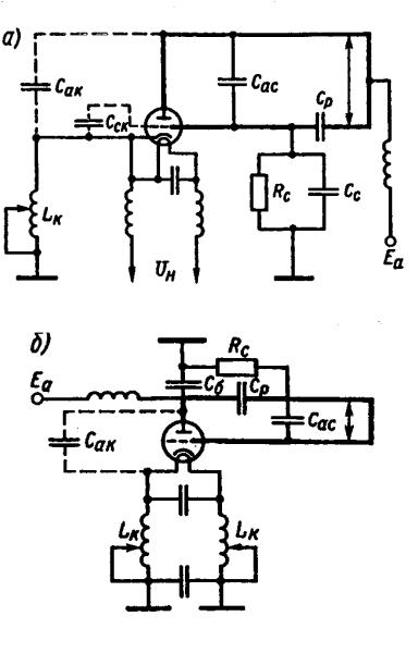 В схеме автогенератора с ОС (рис. 1.4, а) в качестве анодно-сеточного контура используется отрезок короткозамкнутой длинной линии с емкостью С на входе, перестраиваемой с помощью подвижной перемычки. Катодносеточный контур образуется емкостью С с вариометром в цепи катода L. Этот контур замыкается на землю благодаря наличию емкости автосмещения CC .